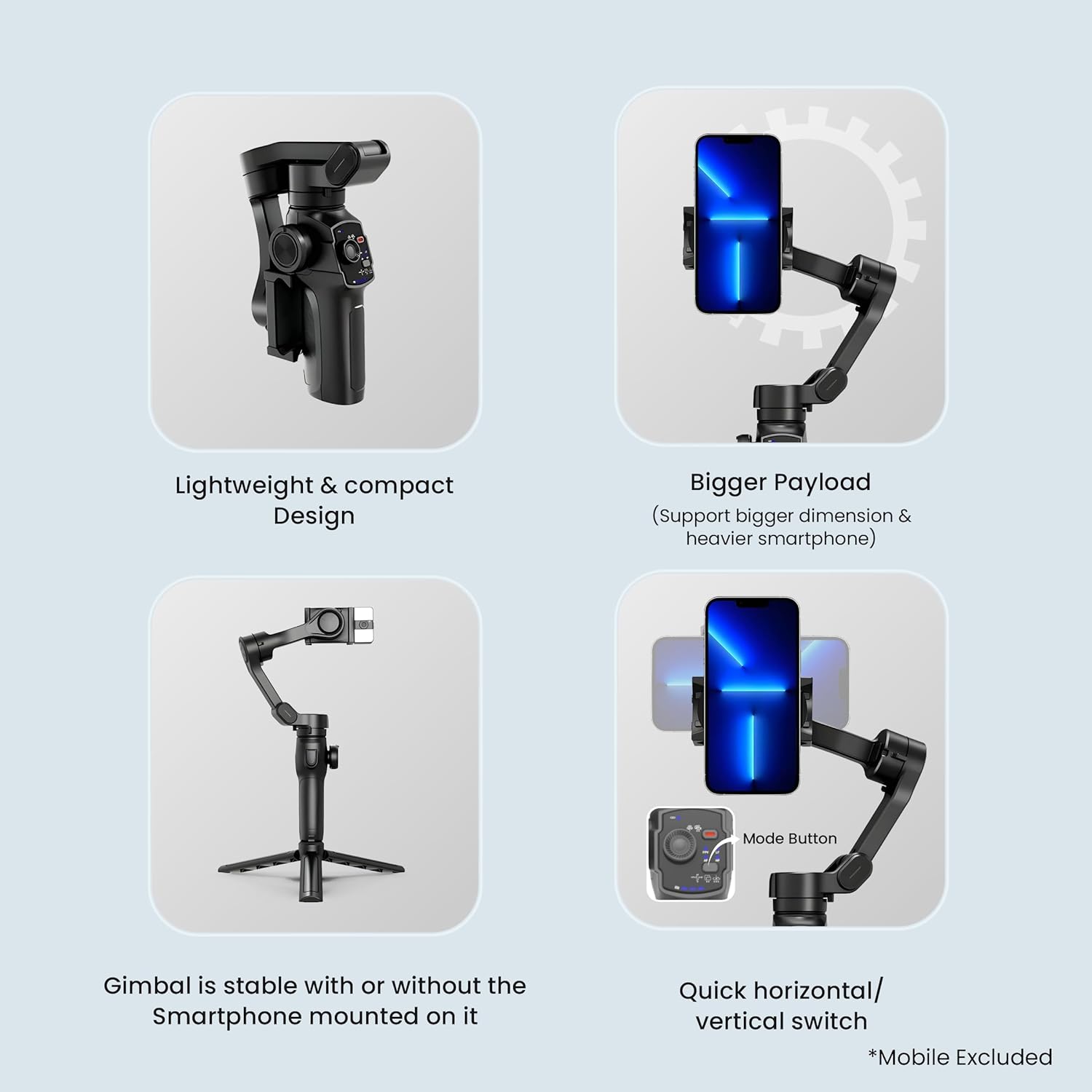 • 𝗟𝗶𝗴𝗵𝘁𝘄𝗲𝗶𝗴𝗵𝘁 𝗗𝗲𝘀𝗶𝗴𝗻: Weighing only 382g, the gimbal is easy to carry, making it ideal for on-the-go videography.