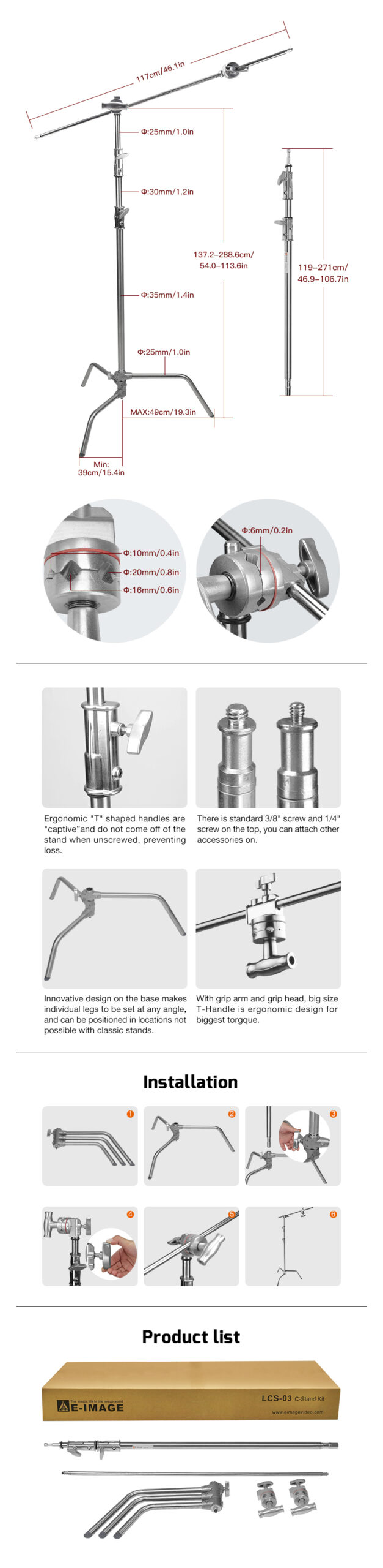 - E-image C-Stand Grip Arm Kit 41.5 inch grip arm fits the removable 2.5″ grip head. with grip arm and grip head, big size T-Handle is ergonomic design for biggest torgque